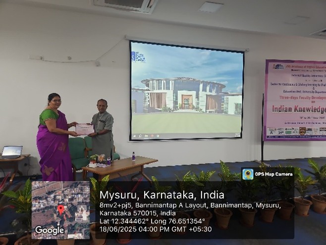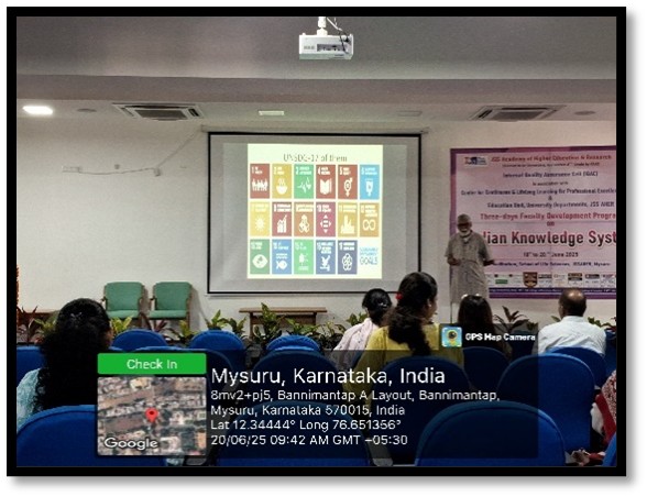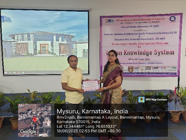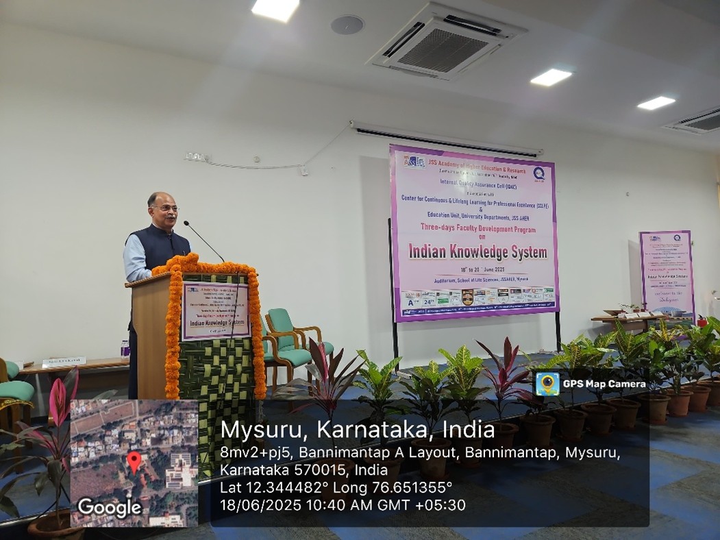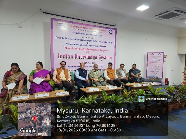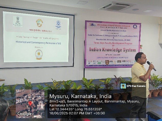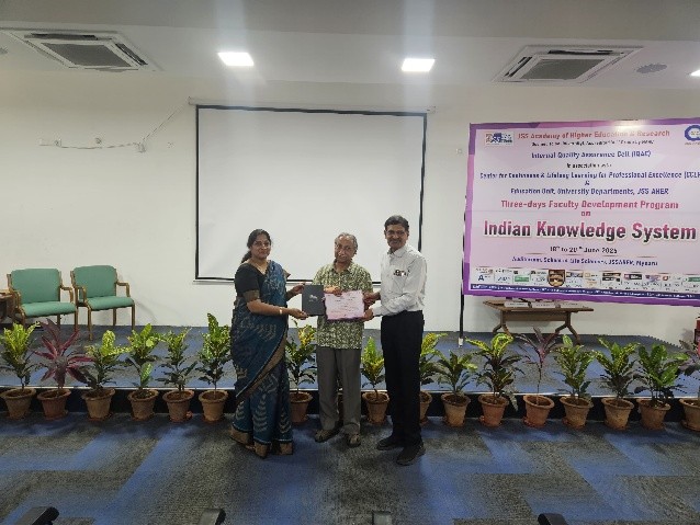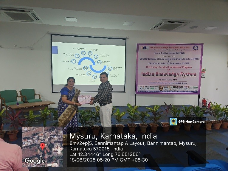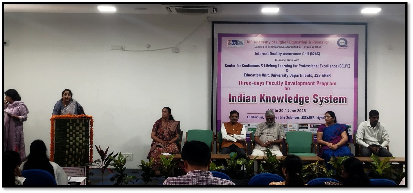 The Centre for Continuous Learning and Professional Enhancement (CCLPE) in collaboration with the University Department Education Unit of JSS Academy of Higher Education & Research (JSS AHER) successfully organized a three-day Faculty Development Programme (FDP) on Indian Knowledge Systems (IKS) from 18th to 20th June 2025. The programme aimed to promote awareness, understanding, and integration of IKS within contemporary educational frameworks, in alignment with the objectives of the National Education Policy (NEP) 2020.