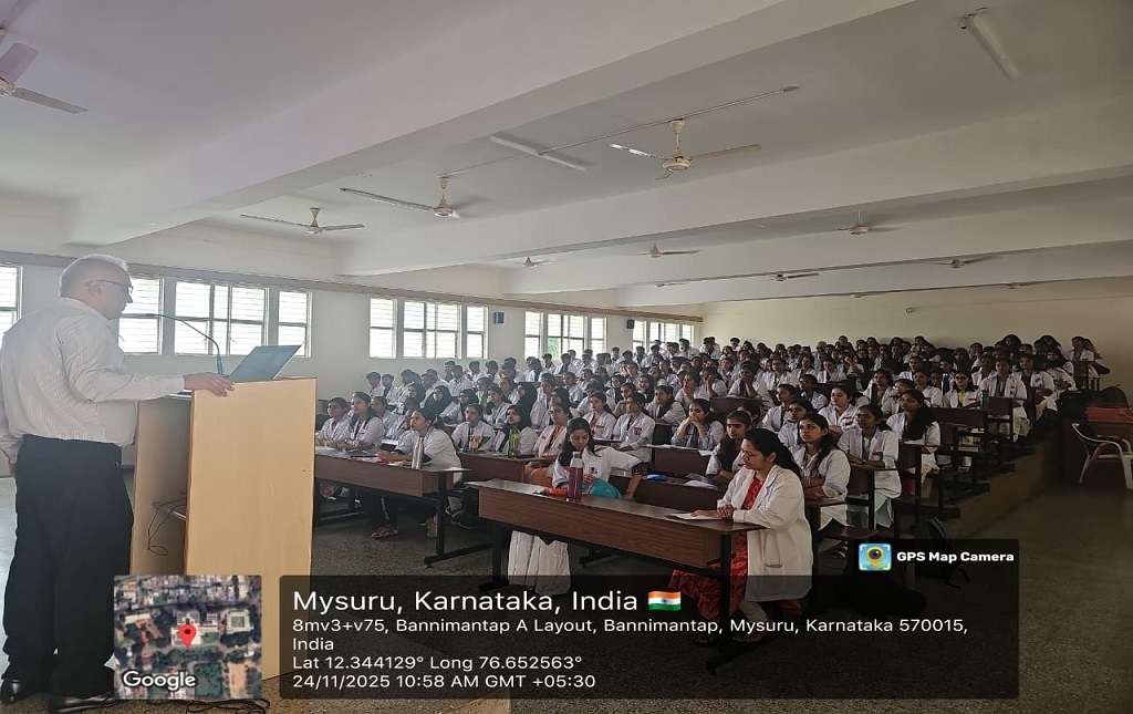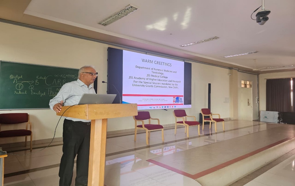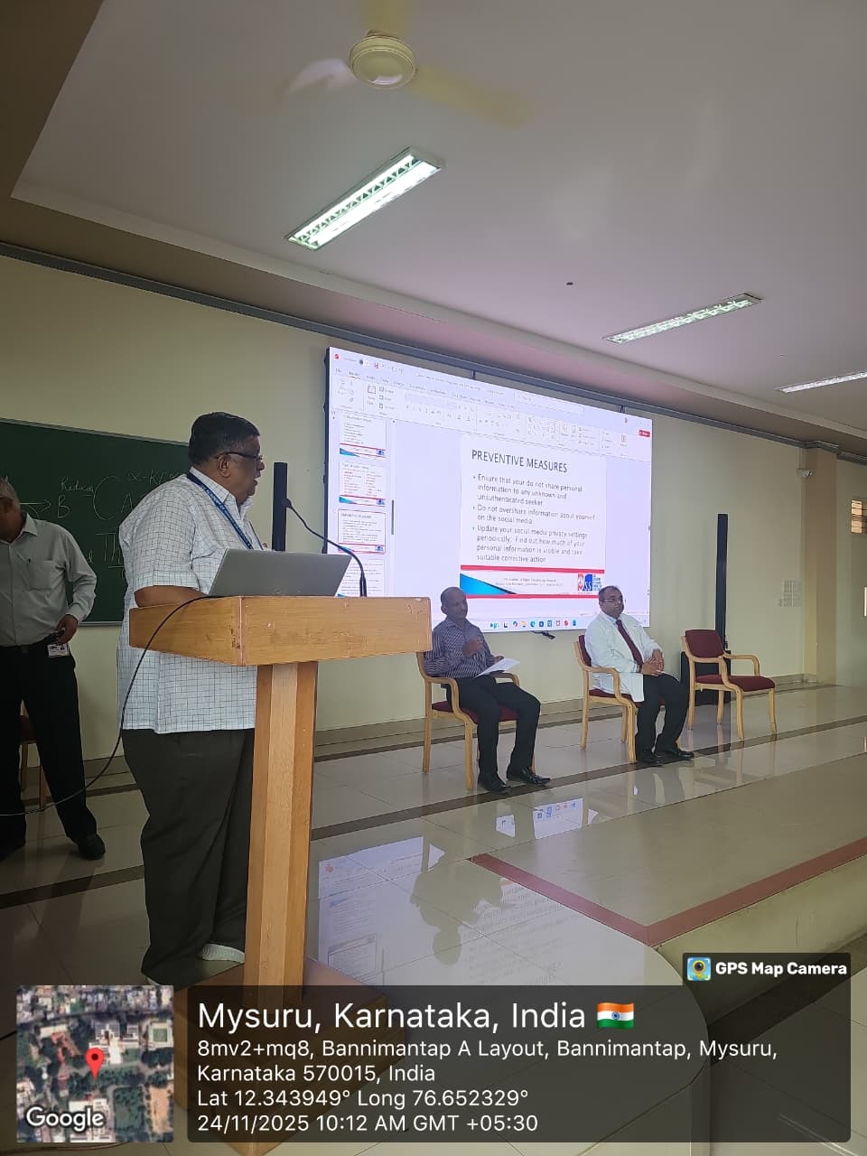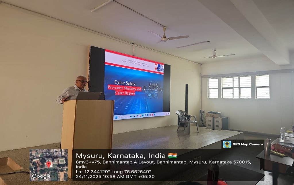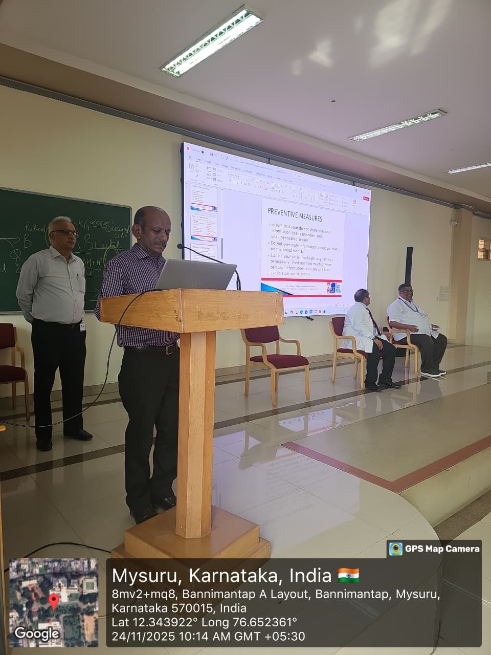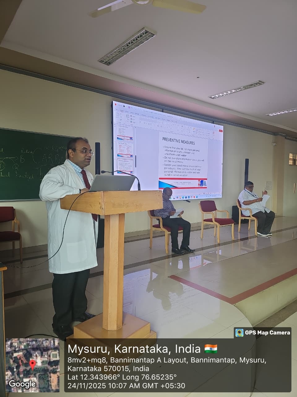 As a part of National Cyber Security Awareness Month, under the banner of JSS Academy of Higher Education & Research (JSS AHER), an orientation session on Cyber Safety: Preventive Measures and Cyber Hygiene was conducted for the first-year students of JSS Medical College on 24 November 2025 at Gallery 6, JSS Medical College, JSS AHER, from 9:45 AM to 11:45 AM. A total of 250 MBBS students and 200 B. Sc students attended the programme. The session was delivered by Dr. G. B. Aravind, Coordinator of Forensic Science and Associate Professor in the Department of Forensic Medicine and Toxicology, who highlighted essential concepts of cyber safety, responsible digital behaviour, safe device handling, password security, cyber threat awareness, and cyber hygiene practices relevant to both personal and academic environments. The programme was attended by Dr. Praveen Kulkarni, Vice Principal, JSS Medical College; Mr. S. R. Satish Chandra, Administrative Officer, JSS Medical College; Dr. Arun M., Professor, Department of Forensic Medicine & Toxicology; Dr. Smitha Rani, Associate Professor, Department of Forensic Medicine; along with all postgraduate students and PhD scholars of the department. In addition to the resource session, Mr. Satish Chandra and Dr. Arun M. addressed the students and shared their insights, emphasizing the importance of discipline, responsible online conduct, and awareness of cyber threats in the modern educational setting. The session received enthusiastic participation from all 450 students and served as an impactful and informative part of their orientation programme under the banner of JSS AHER.