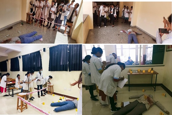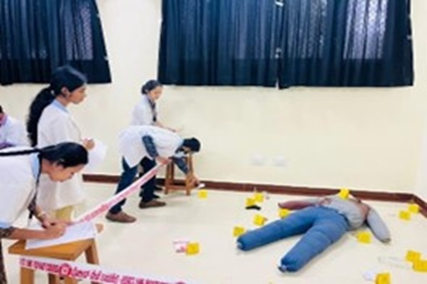 Simulated Crime Scene examination is a part of the curriculum in the B.Sc. Forensic Science Programme. Innovativeness in this arises out of competitiveness. After learning adequate methods of simulating various types of crime scenes, the concerned faculty have devised in creating a competitive atmosphere within the batch of students.