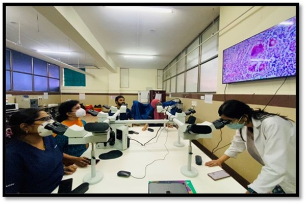 The histopathologic diagnosis of interesting and challenging cases is made by presentation of the cases by the faculty at the multihead microscope. The cases are selected due to diagnostic difficulty, unusual nature, for management purposes such as performance of additional biopsies, special studies etc. or request on the part of clinician or patient.