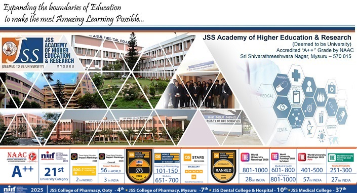 Thus, JSS Academy of Higher Education & Research cater to Medical, Dental, Pharmacy, Life sciences and Health system management professionals with knowledge, skills and competencies at global standards with imbibed core values of respect, professionalism, leadership and social responsibilities to meet the health care needs of mankind. The JSS institutions have had a long-standing legacy in advancing education with both the preparation of educators and the advancement of research and scholarship. Renowned as a destination of learning, research and service the reputation of JSS Academy of Higher Education & Research has become synonymous with quality education in India and abroad.